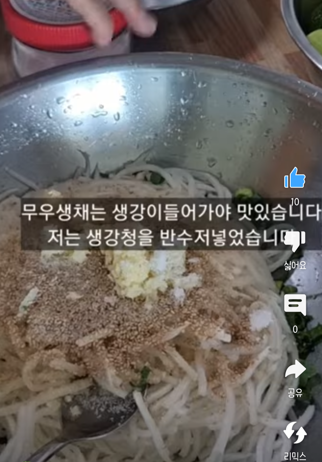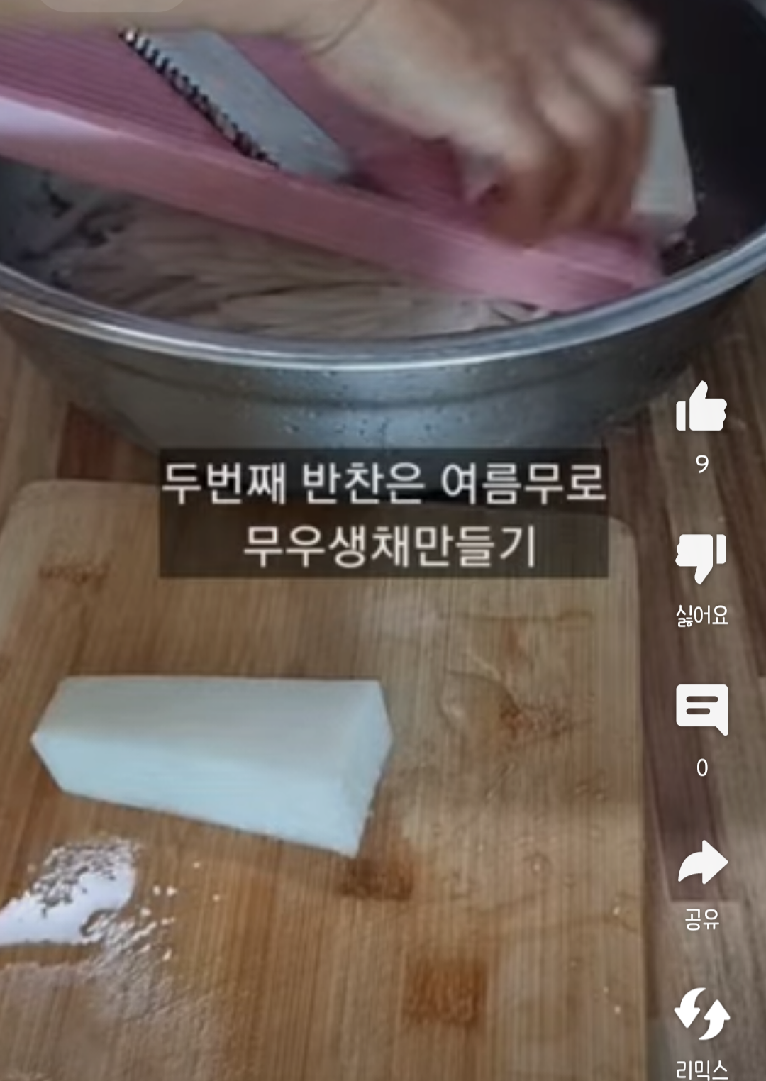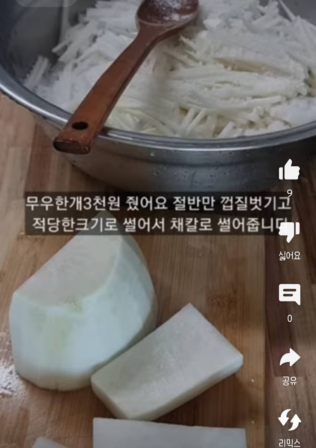 여름무는 가을무에 비해 매운맛(아린맛)이 세기 때문에 그 맛을 중화하기 위해 굵은 소금 1큰술 과 당원(뉴슈가) 반큰술을 넣어 10분 정도 절여 놓습니다.
